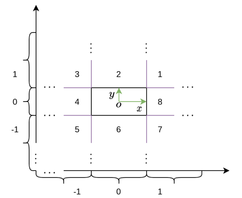 如下图所示,将矩形盒的外围分成如下 8 个区域,关于区域的划分,可以根据线段起始点和终点分别在