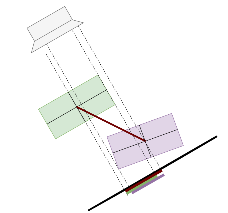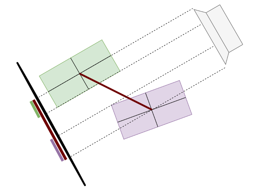 关于矩形盒与矩形盒的碰撞检测采用分离轴原理,即通过判断任意两个凸多边形在任意角度下的投影是否均存在重叠,来判断是否发生碰撞。若在某一角度光源下,两物体的投影存在间隙,则为不碰撞,否则为发生碰撞。 如下图所示,将左右两个矩形盒投影到左侧矩形盒长边所在轴上,从图中可以看出投影重叠;