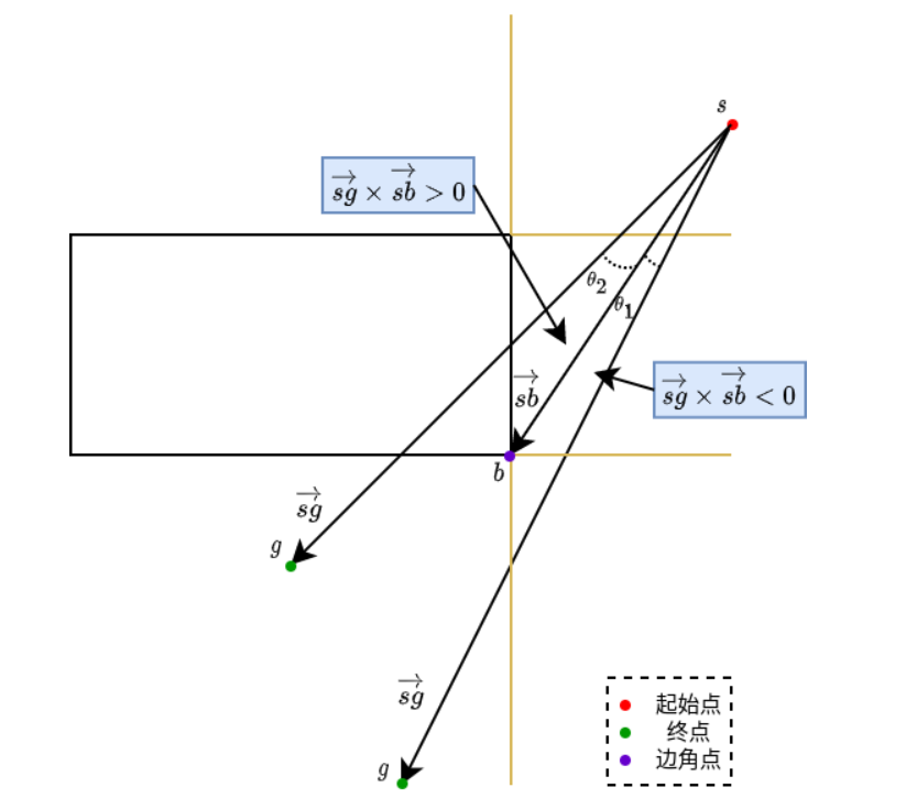 当终点位于区域 6 时,先判定线段与矩形盒是否交叠,如下图所示,通过计算向量叉乘 \overrightarrow{s g} \times \overrightarrow{s b} , 判断线段是否与矩形盒交叠