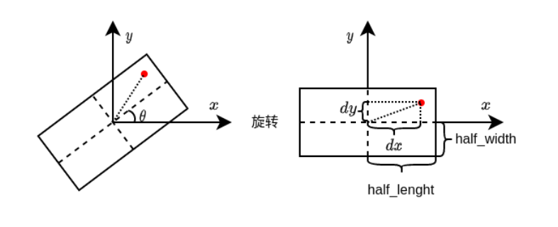如下图所示,红色圆点与矩形盒的关系如下图左侧,为了便于判定红点是否在矩形盒内,将下图左侧整体按照航向角顺时针旋转 \theta 角度,得到下图右侧状态。此时,只需要判定红点的坐标 (d x, d y) 是否满足 |d x|<=\text { length }_{half} 或者 /|d y|<=\text { width }_{helf} ,则说明红点位于矩形盒内.